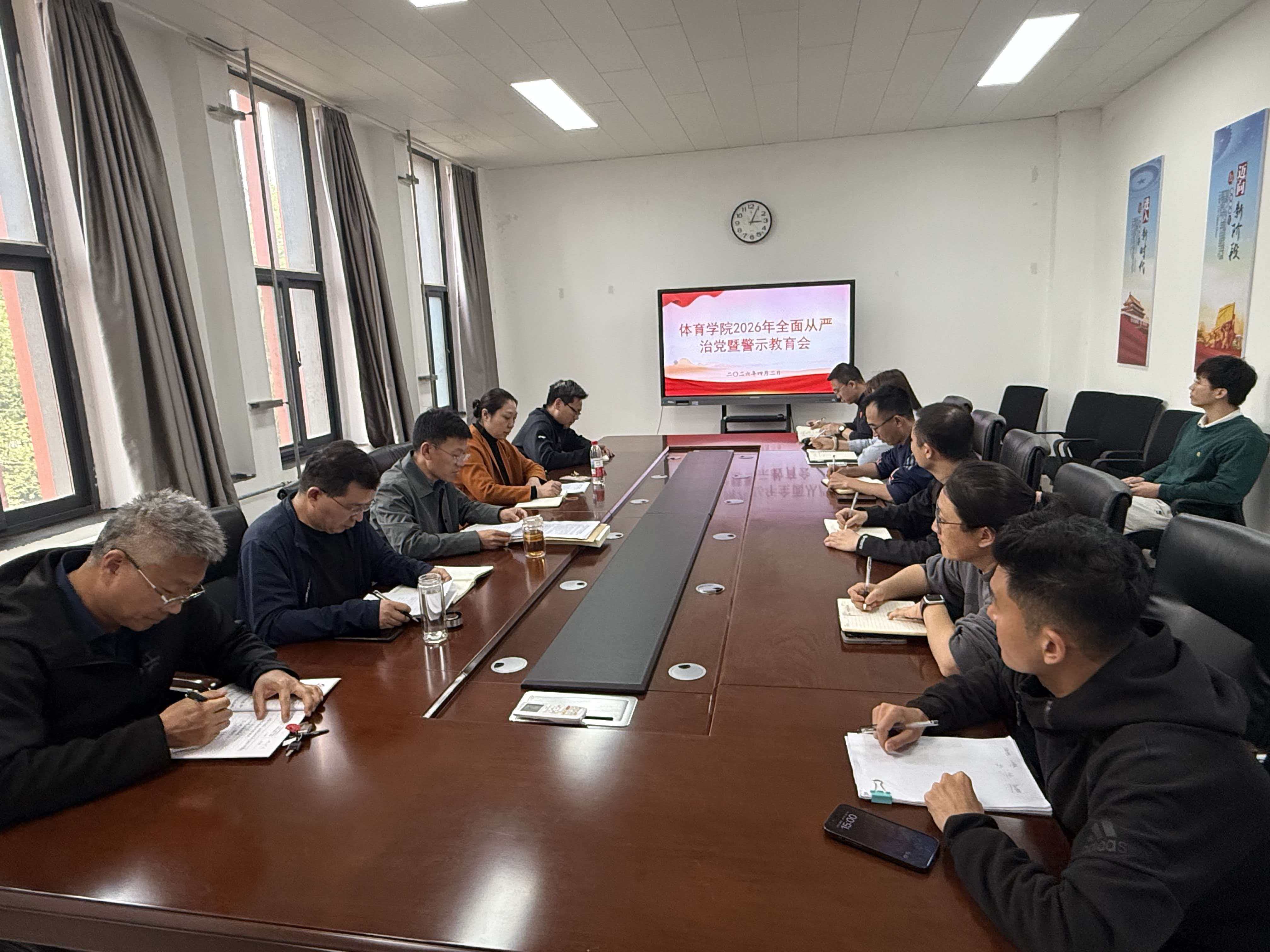 4月2日下午,体育学院在学院楼304会议室召开2026年全面从严治党暨警示教育会,学院领导班子成员、科级干部、各党支部书记参加会议。会议由学院党委书记袁杰主持。