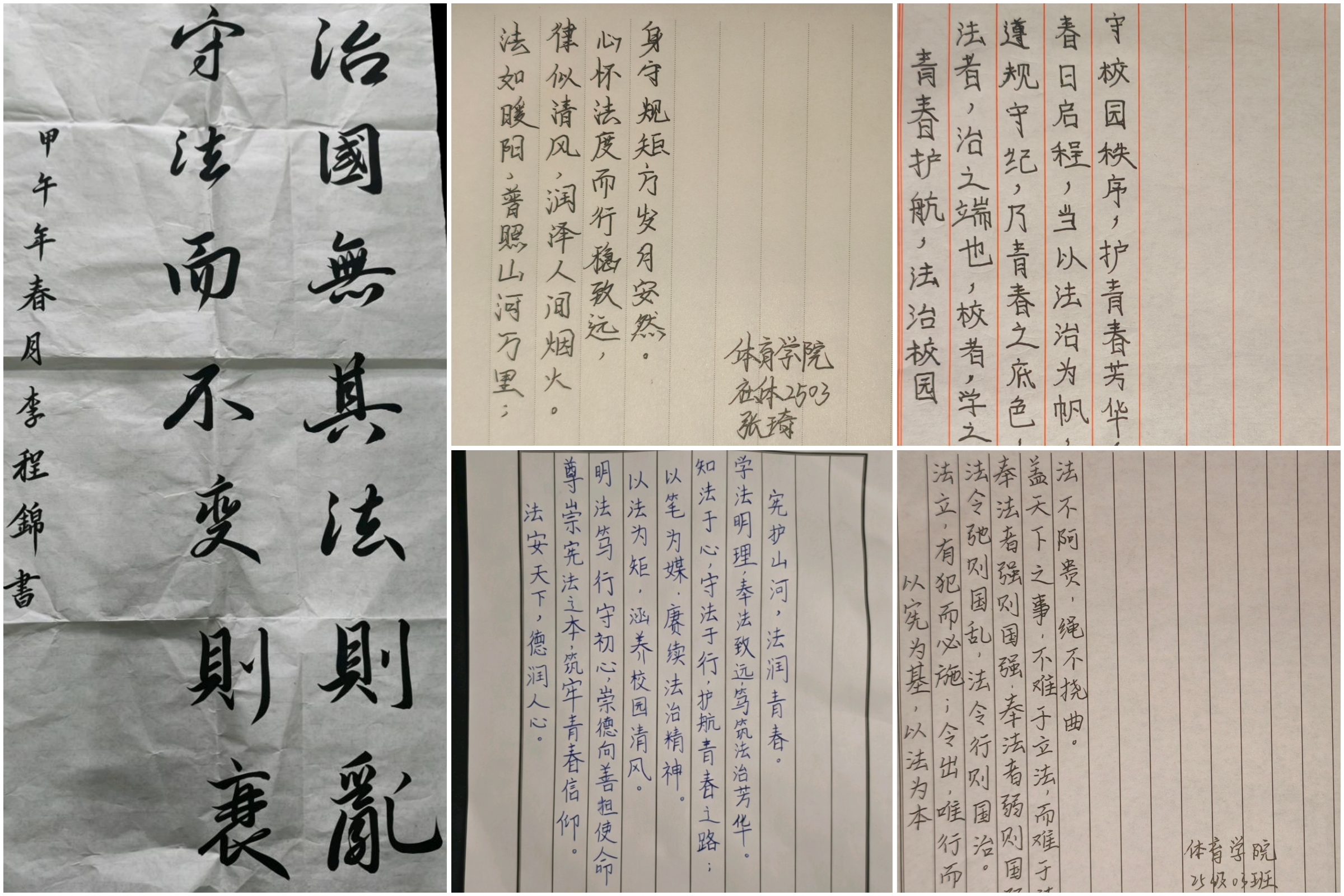 为深入学习习近平法治思想,提升大学生法治意识与文化素养,4月中旬,体育学院组织举办以“学法明纪,墨书正气”为主题的法治主题书法比赛活动,全院本科、研究生踊跃参与。