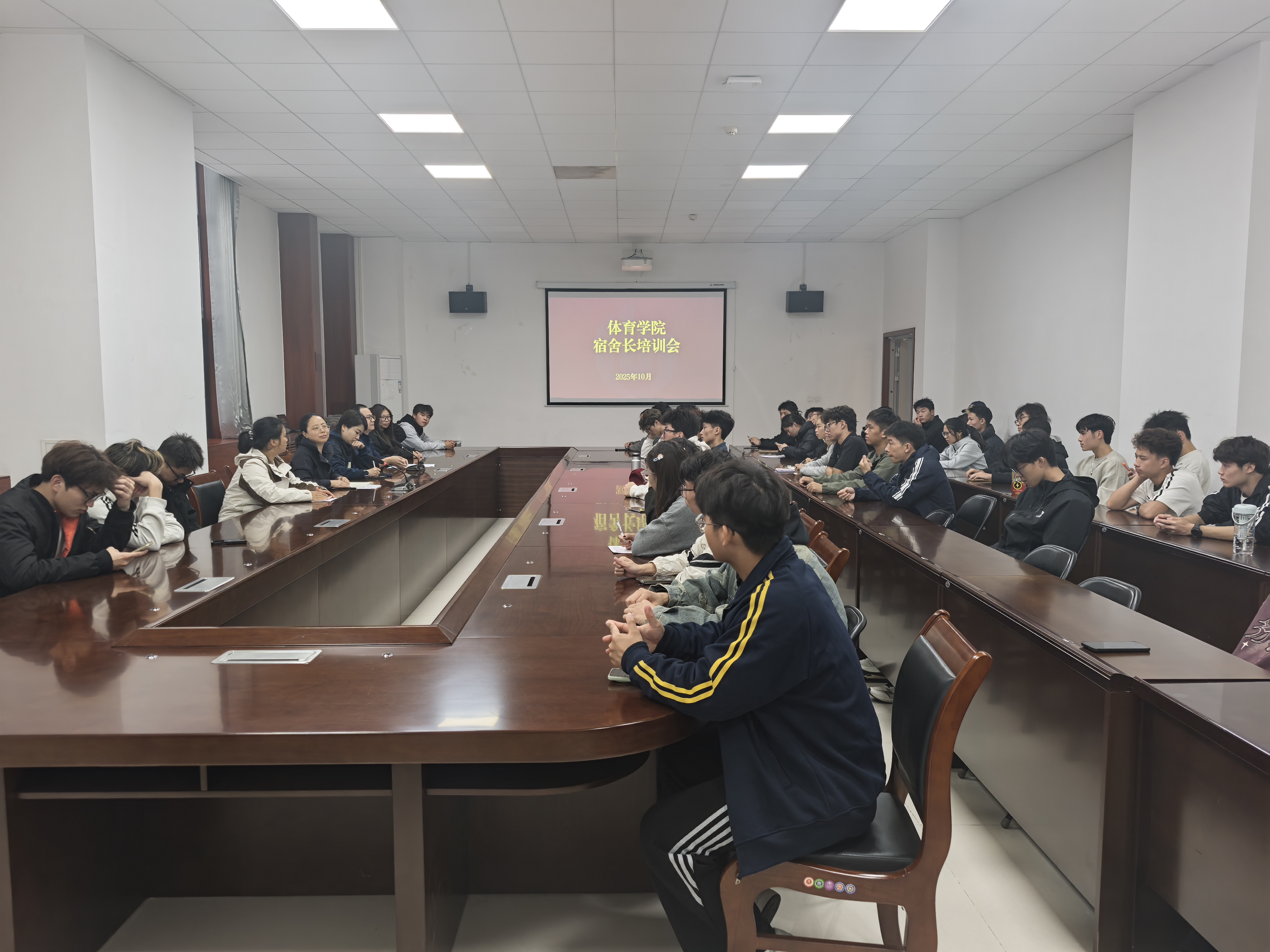 10月10日中午,体育学院在学院一楼大会议举办宿舍长培训会。学院党总支副书记王静、全体专职辅导员、全体本科生及研究生宿舍长参会。